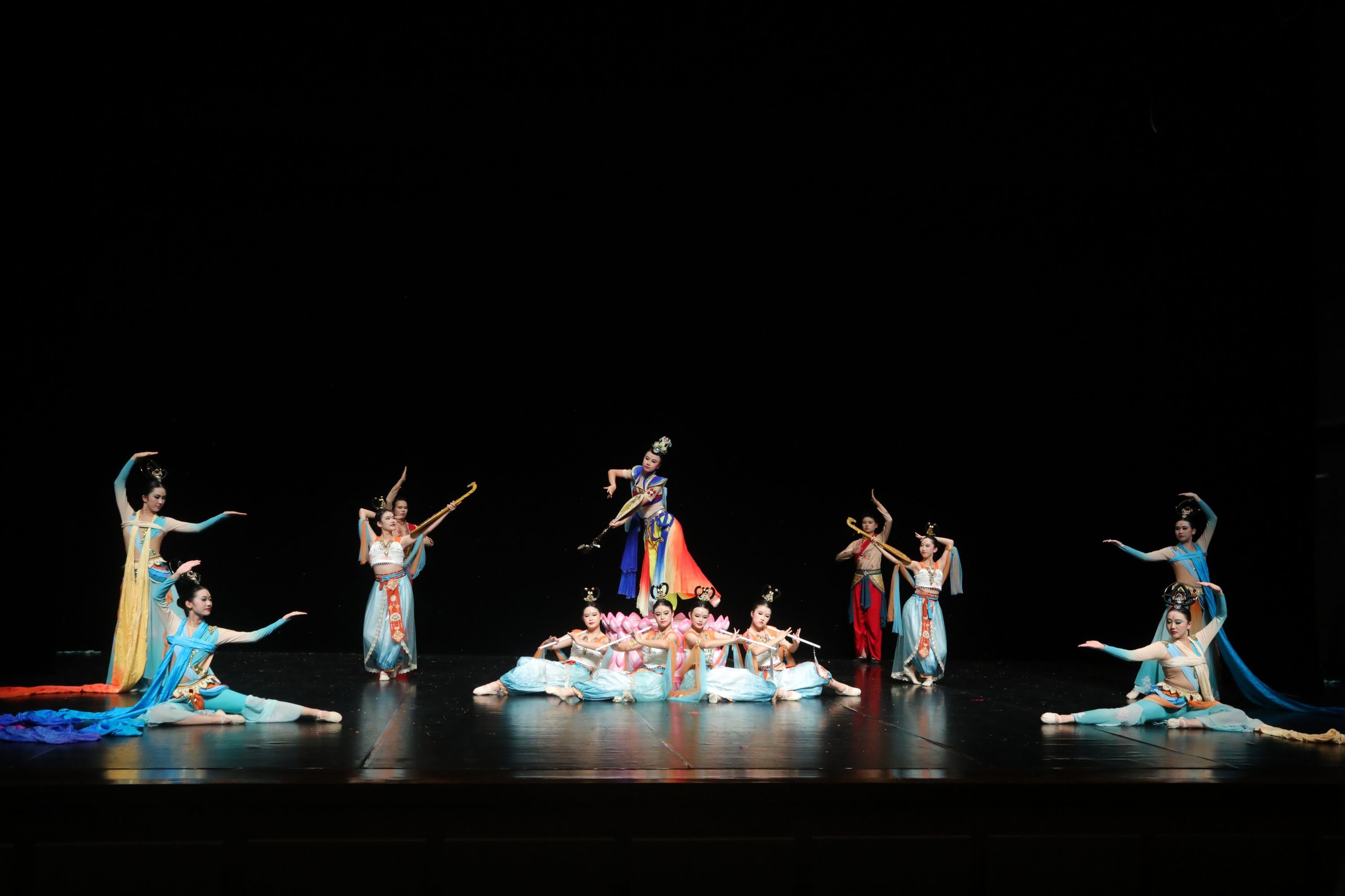 舞蹈《丝路繁花》灵感来自敦煌壁画,由学校舞蹈教师唐晗绮编排,将《反弹琵琶》《飞天伎乐》《胡腾》《千手观音》等经典丰富的形象化成舞蹈。惊艳飞天的曼妙仙女凌空蹁跹,大唐盛世百乐齐鸣,一幅美轮美奂的丝路风情呈现开来。同学们通过了解和演绎不同的舞姿造型,传承了包容开放、向善守正、通而不统、和谐共生的敦煌精神。