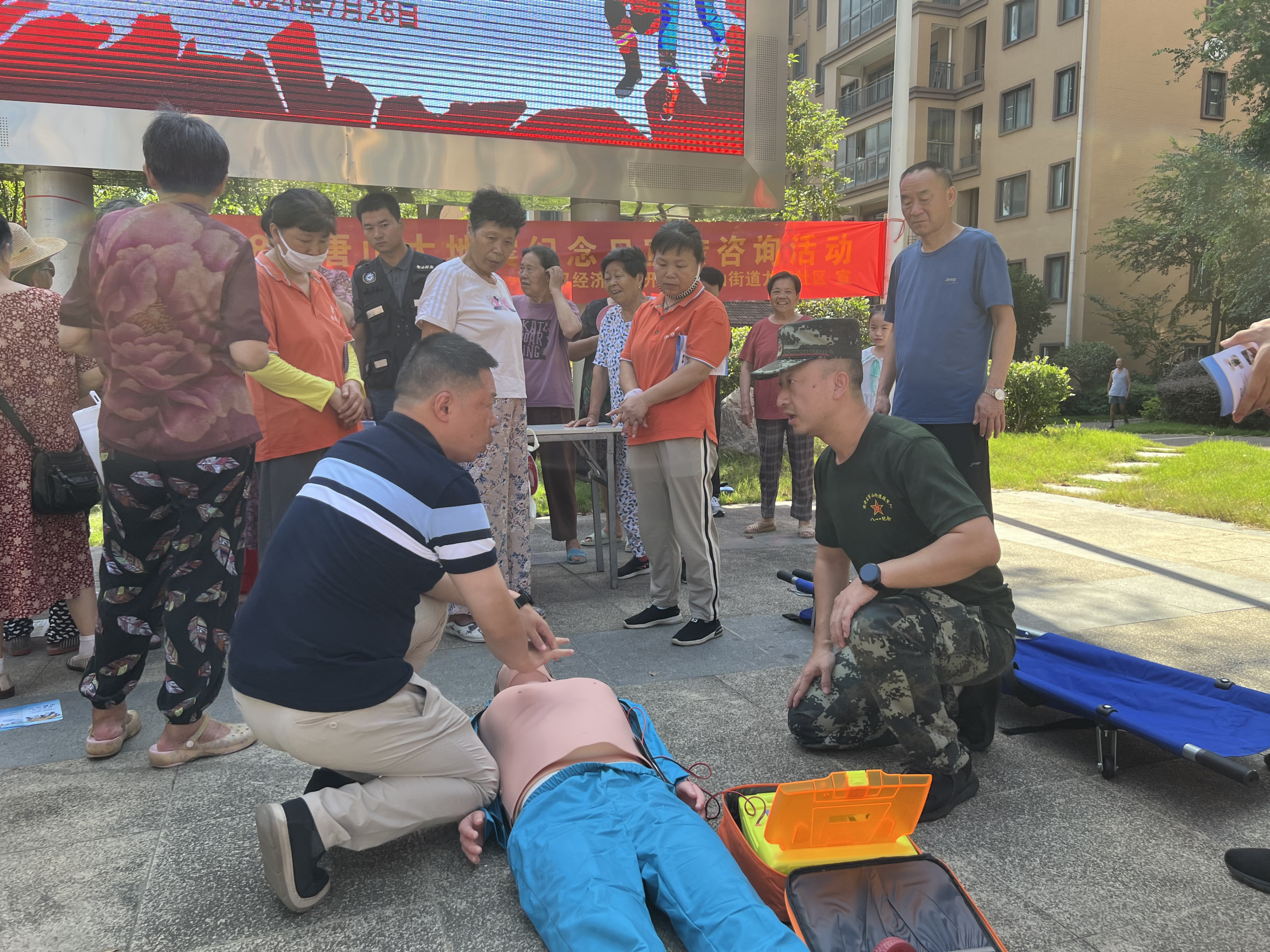 活动现场还设置了互动体验区,军山街龙湖社区应急服务站的工作人员为居民讲解心肺复苏、海姆立克急救法等常用急救知识,并邀请在场居民群众参与模拟演练。