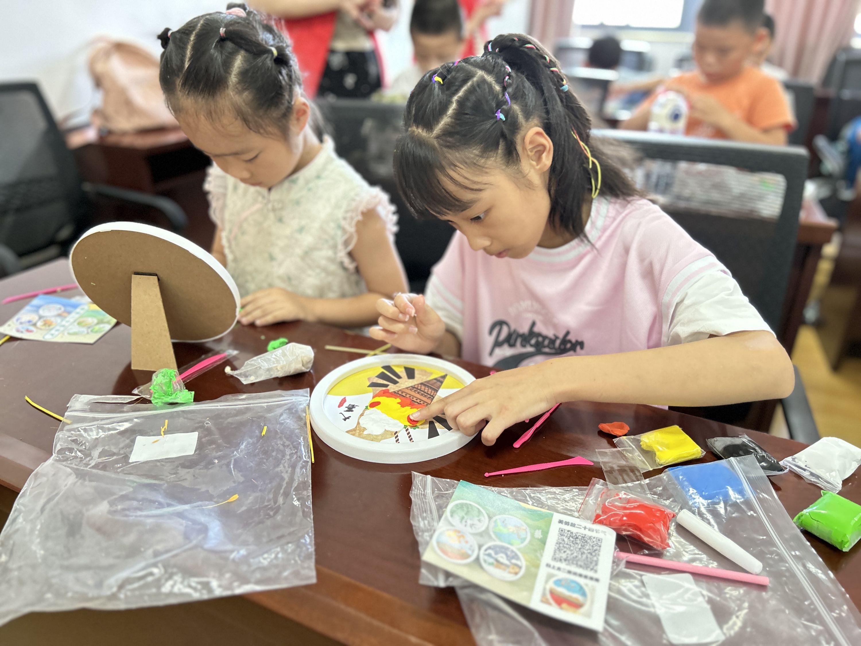 随后的手工制作环节,孩子们在志愿者老师的指导下,用轻黏土、画笔、丝带等材料,制作出了一幅幅精美的二十四节气手工画。