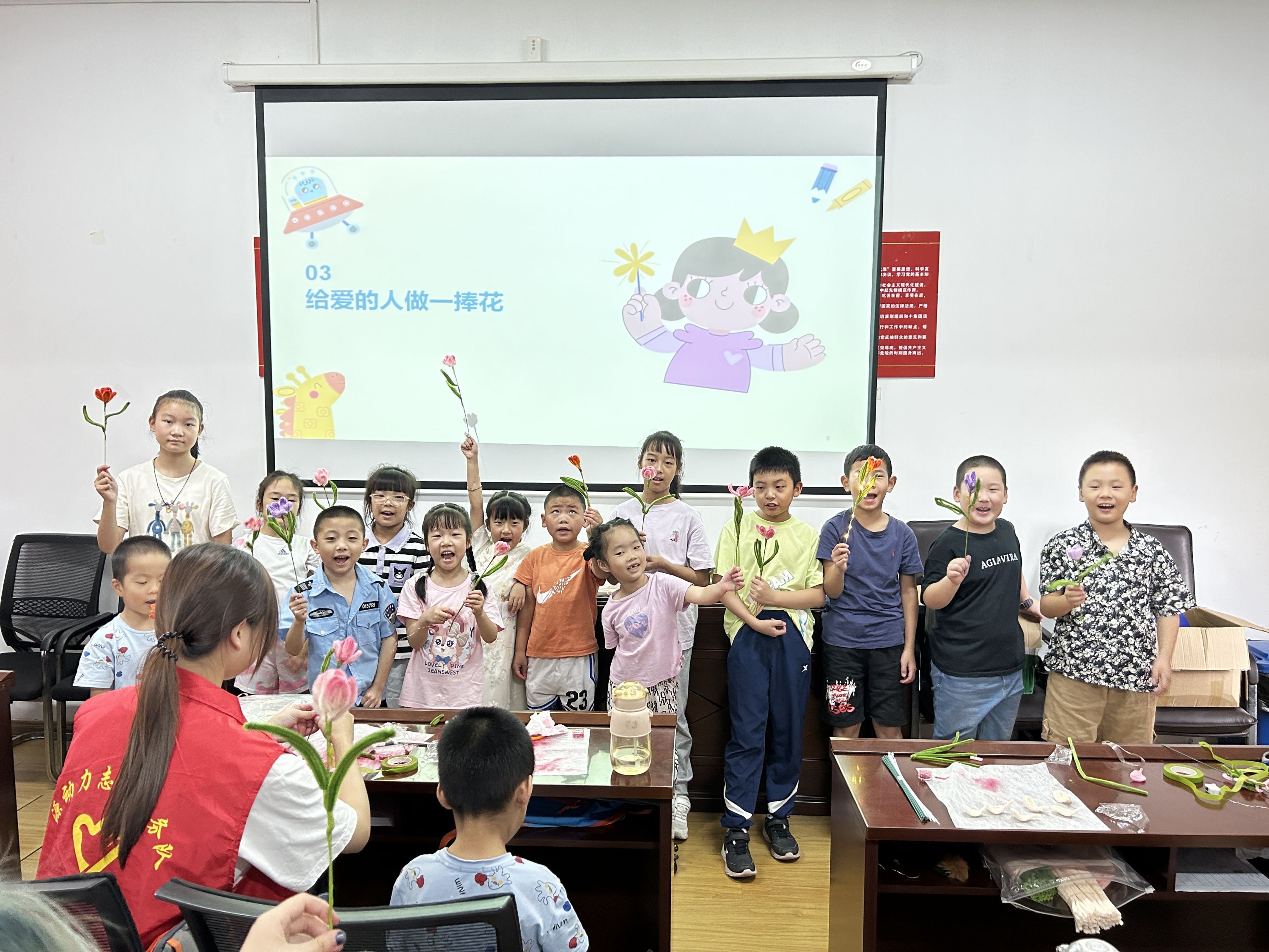 “今天我们做一束花,送给你们爱的人,好不好?”7月25日,“给爱的人做一捧花”的课堂上,社区工作人员通过播放视频教学,手把手耐心给孩子们进行讲解指导,不一会儿,一支支五颜六色的花束出现在孩子们手中。“我要送给妈妈!”“我要送给志愿者老师!”他们手舞足蹈地举着手中的花高声喊道。