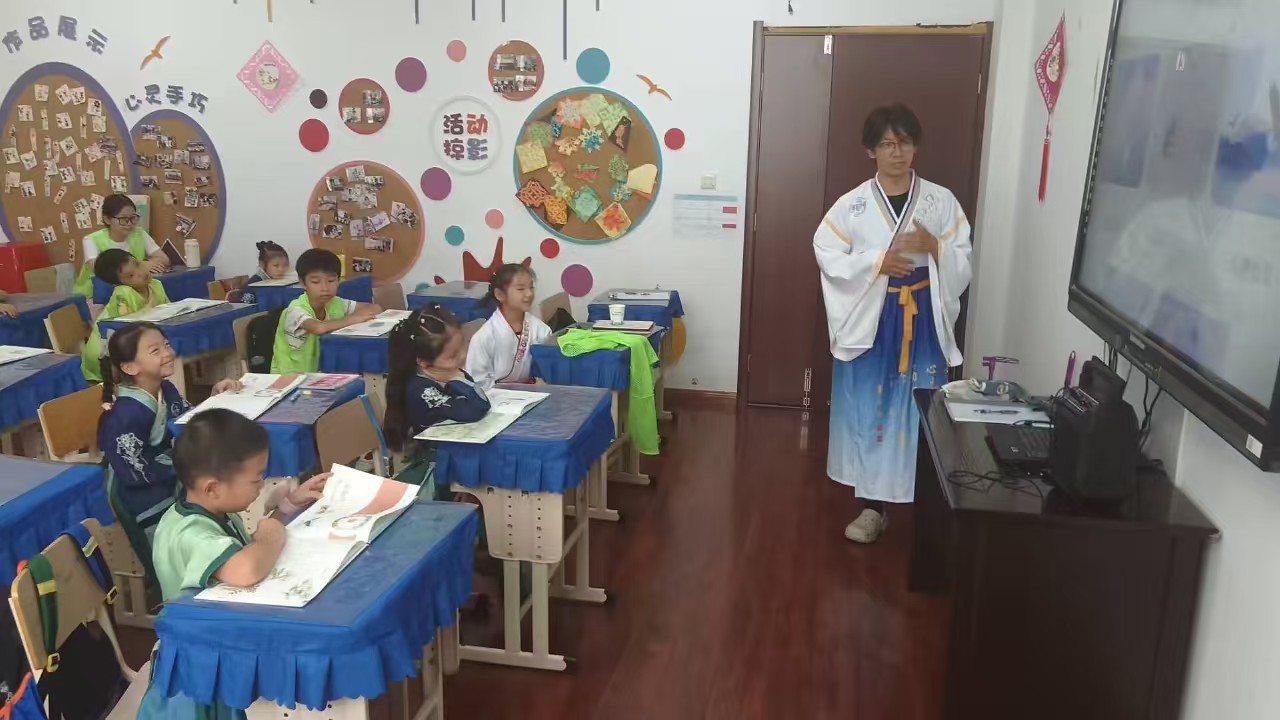 “春雨惊春清谷天,夏满芒夏暑相连。秋处露秋寒霜降,冬雪雪冬小大寒。”在碧湖新村社区暑期托管班的教室里,身着汉服的孩子们齐声朗诵着二十四节气歌。课堂上,志愿者老师通过多种形式,如观赏图片、讲述故事、教唱《二十四节气歌》、播放视频等,为孩子们深入浅出地解读了各个节气的民俗典故、时令养生知识以及节气诗词等,使孩子们对二十四节气留下了初步的深刻印象。