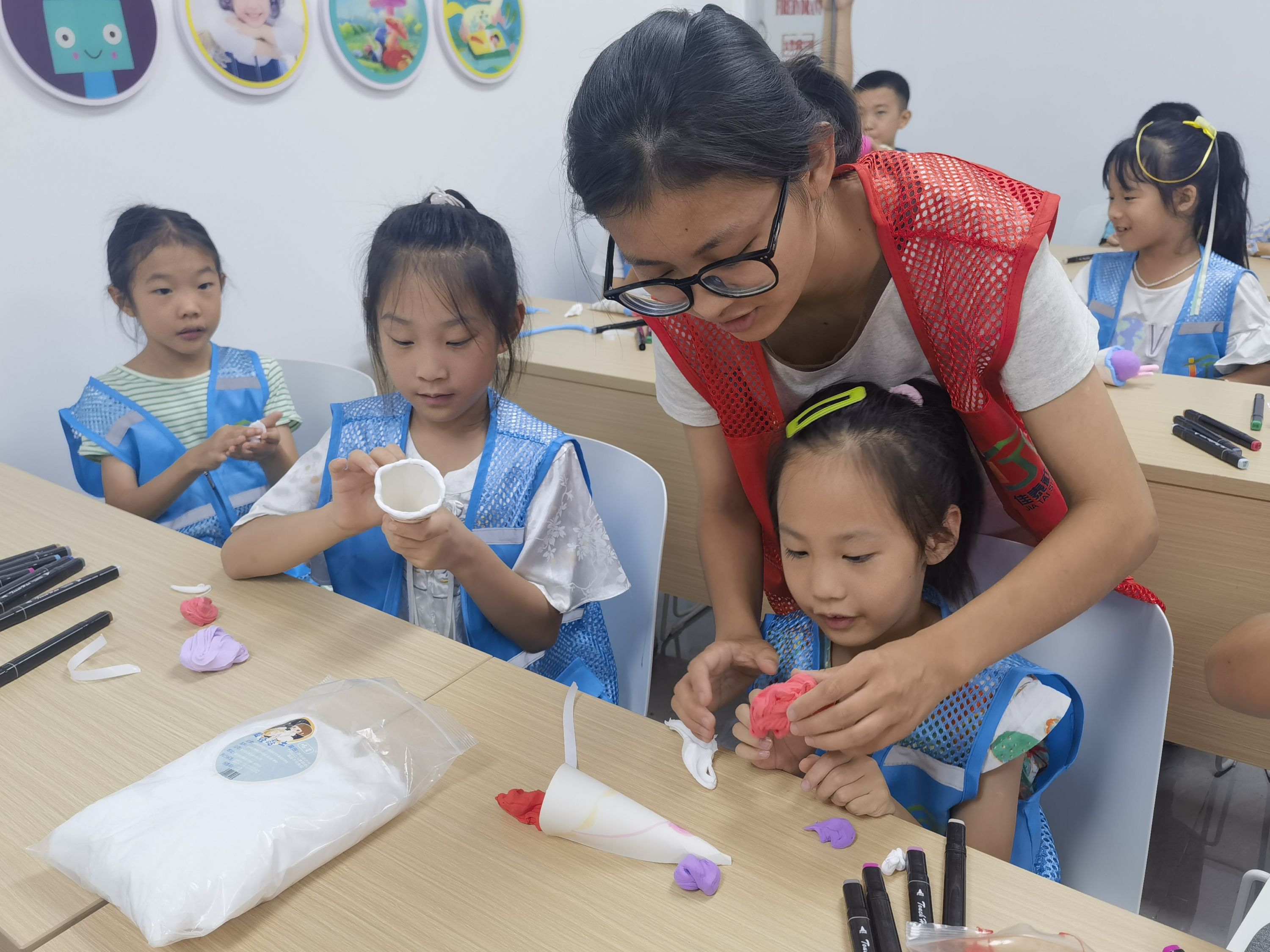 在冰激凌DIY活动环节,孩子们用五彩斑斓的超轻黏土,制作出棒棒糖、笑脸、巧克力豆、彩虹桥等小物件。把这些小物件组合在一起形成了美味可口的冰激凌,孩子们脸上洋溢着满满的成就感。一位小朋友开心地表示,“你看,这是我做的香芋冰激凌,上面还有彩虹棒棒糖,一定是最好吃的!”