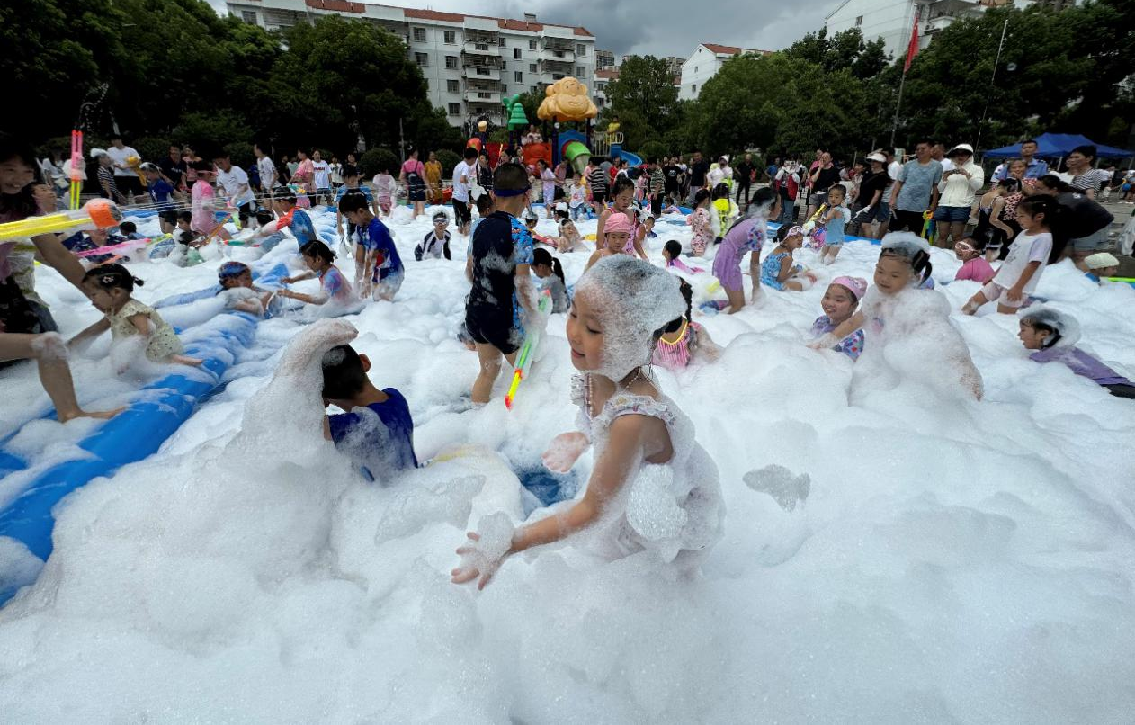 随后,“泡沫一夏”活动将气氛推向高潮。机器轰鸣间,无数洁白的泡沫如雪花般漫天飘舞,整个活动区域瞬间变成梦幻般的童话世界。孩子们在泡沫海洋中尽情奔跑嬉戏,大人们也仿佛回到童年,一同享受着这份轻松愉悦。