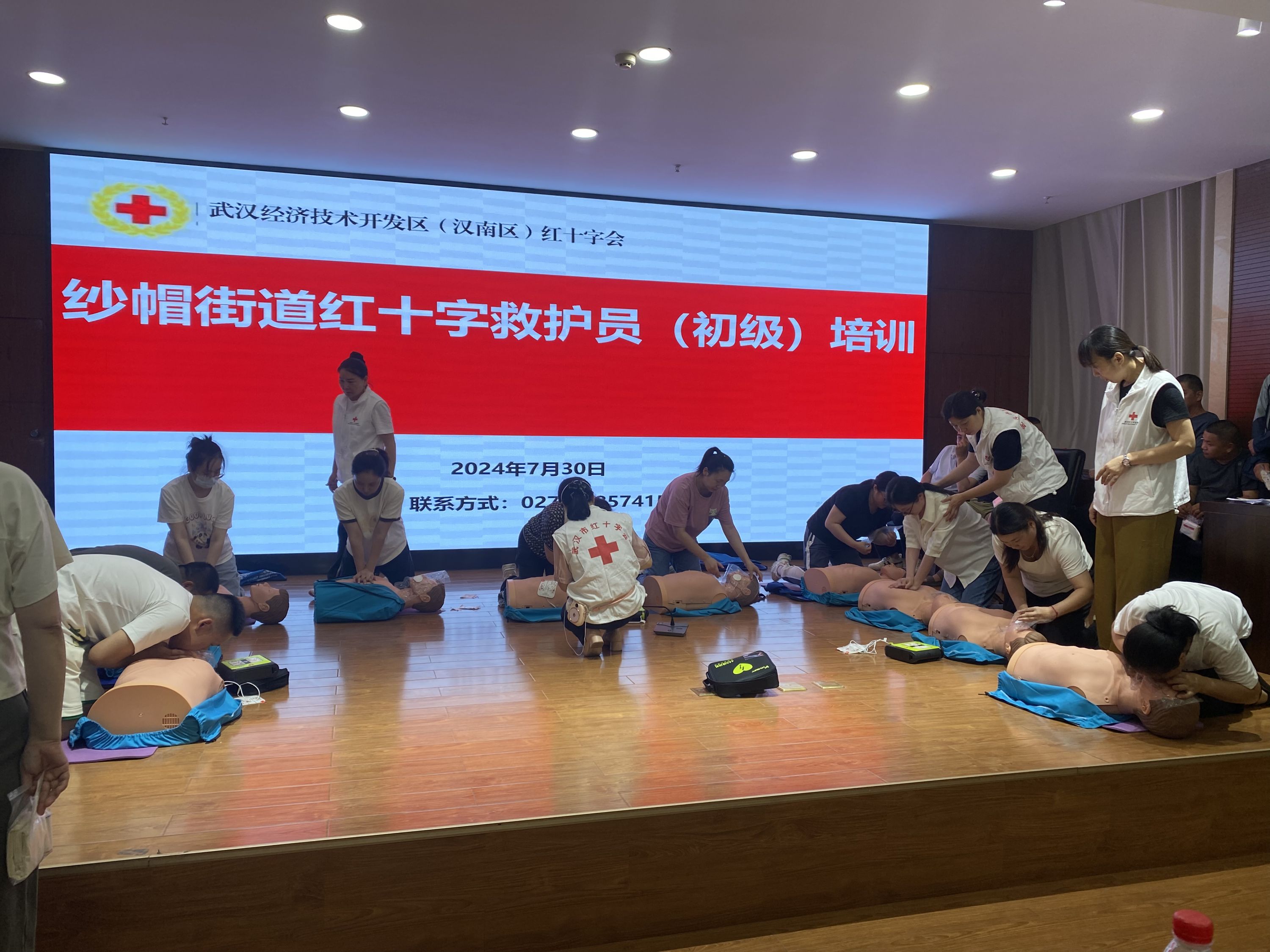7月30日,纱帽街道办事处联合区红十字会举办救护员初级培训会,街道机关、社区(村)、志愿者及长江救援服务队等90余人现场学急救,在纱帽街道掀起学习急救知识的新热潮。