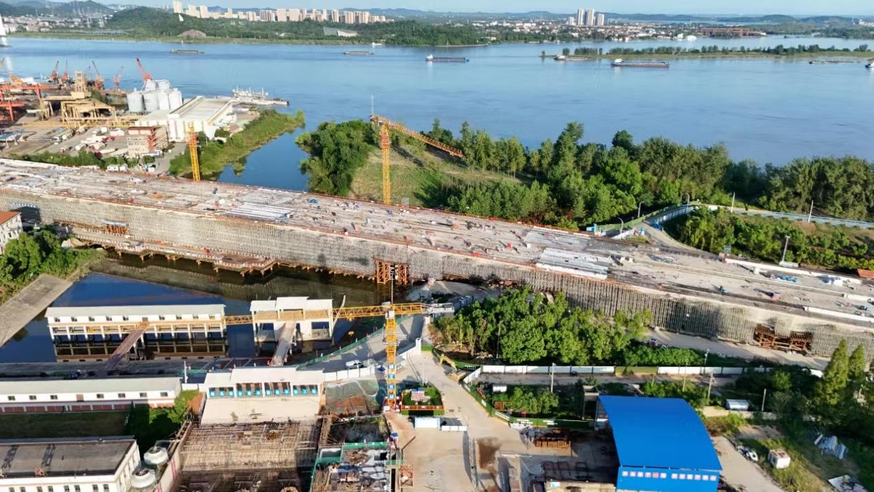 左岸大道大军山泵站桥11#、12#墩位于出水渠边坡,进入汛期后,水位最高时距离栈桥桥面不足1米。项目创新采用灌注桩、钢管柱少支架与盘扣支架组合,增强稳定性并扩大过水面积,减少对泵站抽排影响。同时,军山科投集团与区水务局、泵站管理处紧密沟通,监控排水情况,组织参建单位在施工区及军江大堤实施严密隐患排查与日常巡视,确保施工安全。