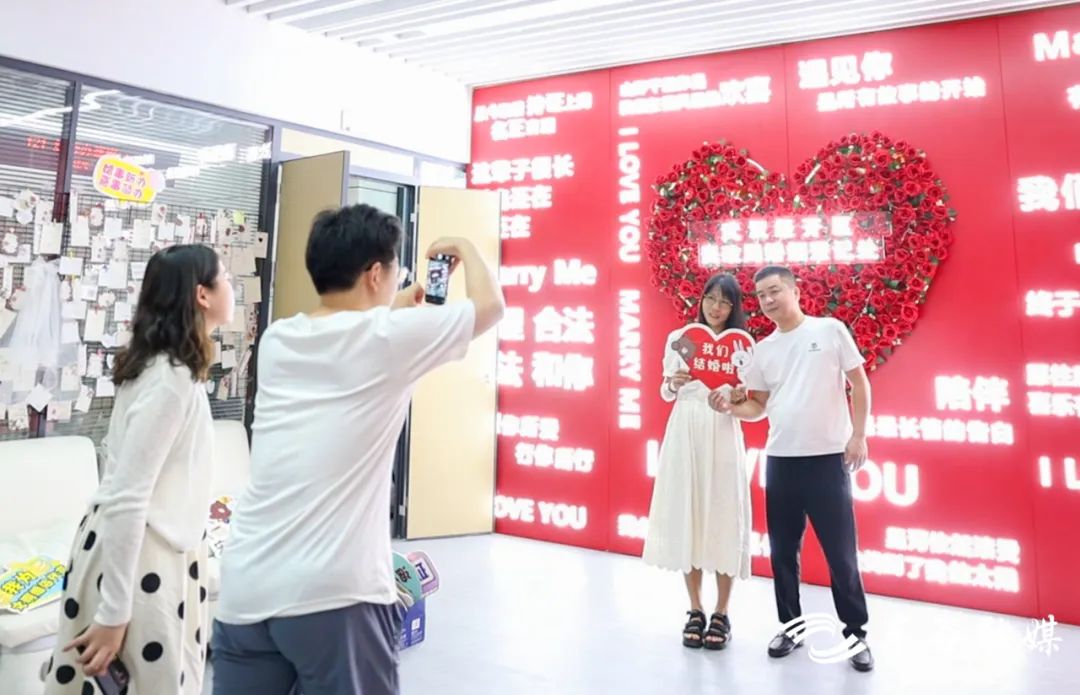 今天,婚姻登记处大厅门口竖起了大大的“喜”字,宣誓大厅内悬挂着喜帖,墙上挂着镶嵌着365朵红玫瑰的心形喜花。
