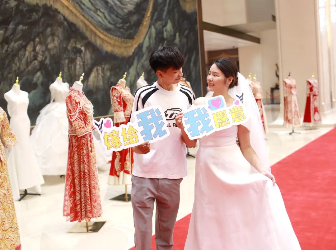 在中国车谷国际体育文化交流中心长城厅,新娘或穿上中式礼服、或穿上洁白婚纱,与另一半集体说出爱的誓言。