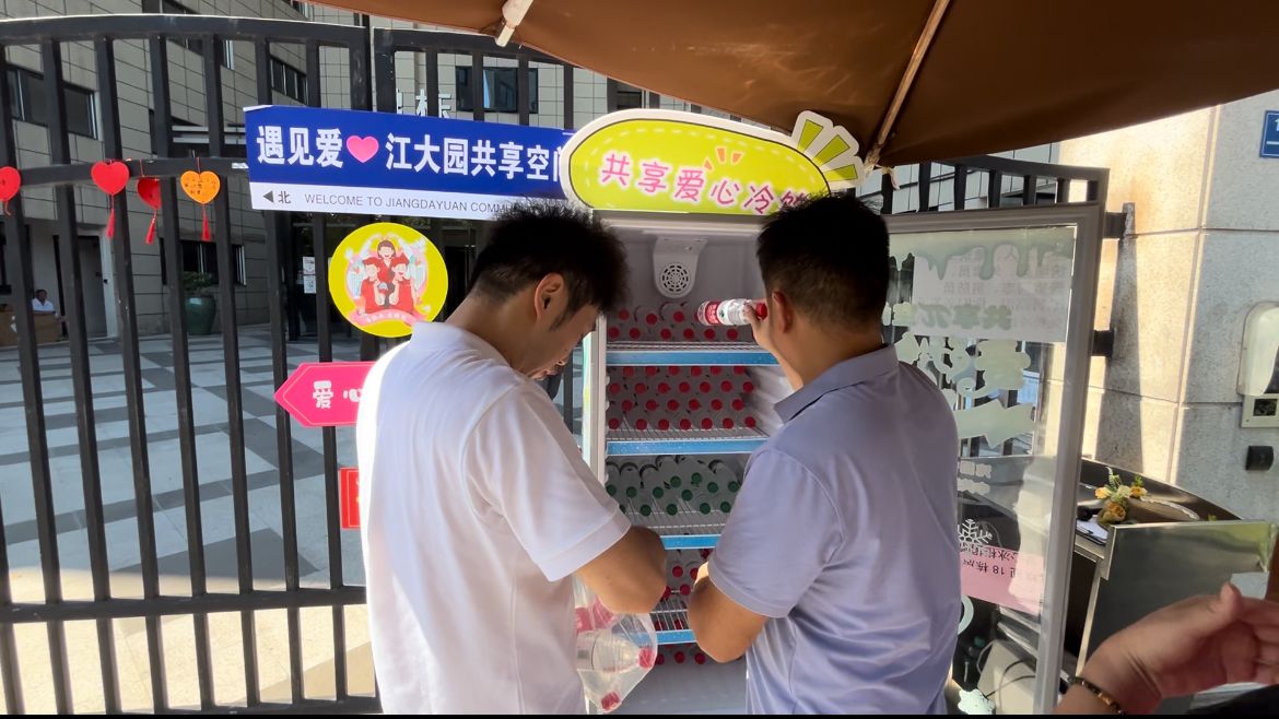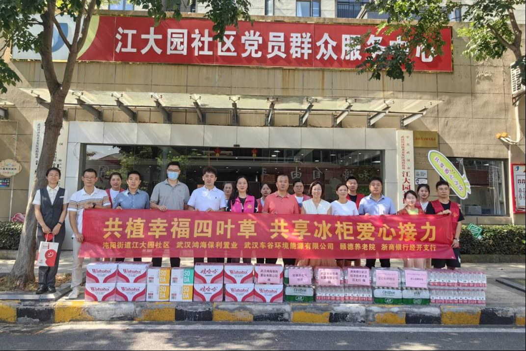 车谷融媒8月13日讯 8月9日,沌阳街道江大园社区联合武汉车谷环境能源有限公司、武汉鸿海保利置业有限公司、颐德养老院和浙商银行经开支行共同开展共享冰柜爱心接力活动。
