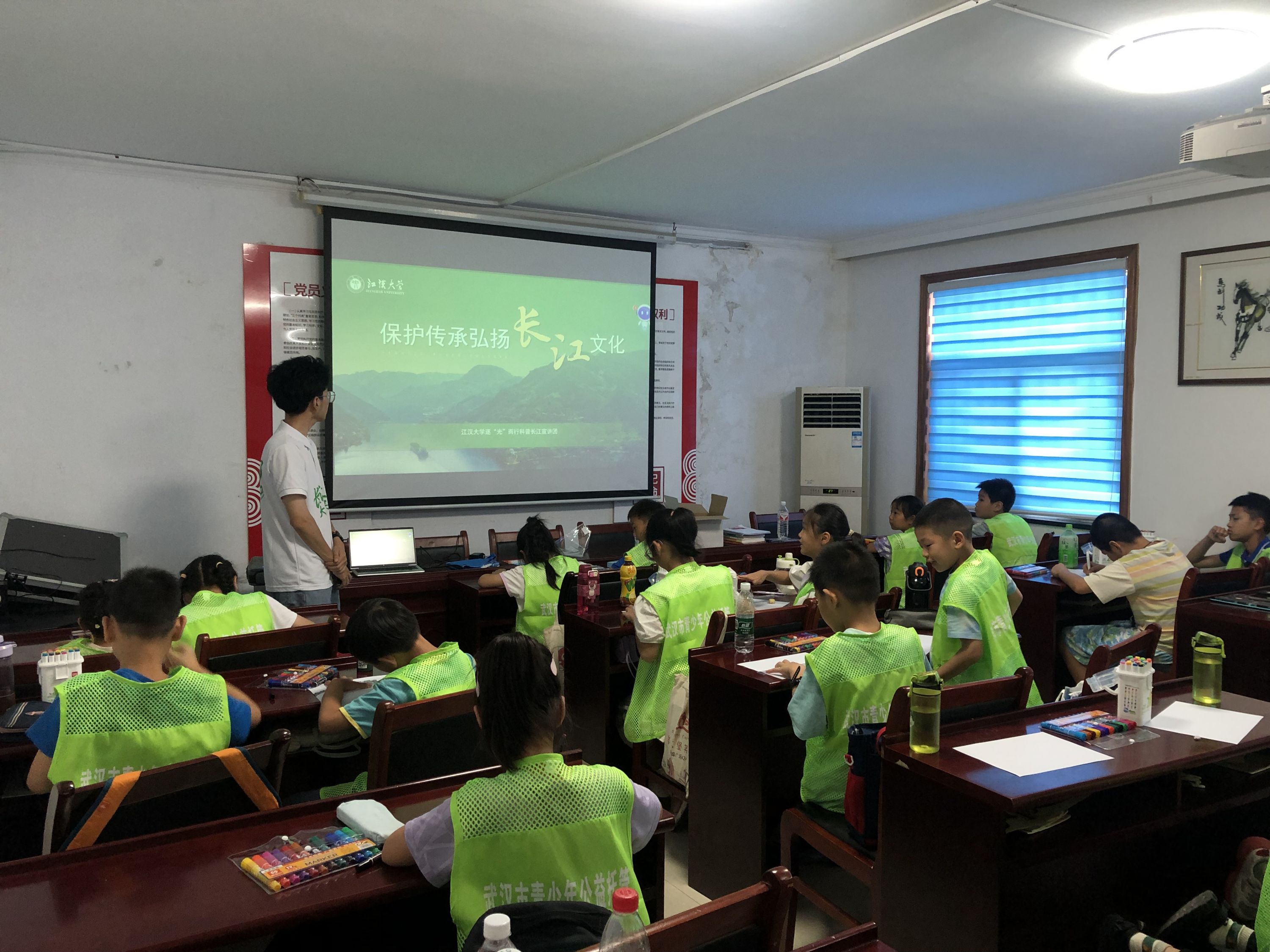 8月12日,沌阳街道金荷社区新时代文明实践站联合江汉大学光电材料与技术学院开展“守护长江之脉 共绘翠色华章”活动,在社区暑期公益托管班里,孩子们正在热烈讨论。