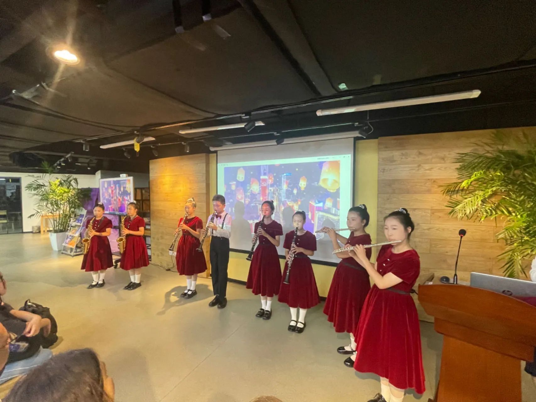 沌口小学龙吟鼓管乐团的学生们演奏了曲目《共迎未来》和《Jubileus》,他们以“乐”为媒,表达对未来的美好期望。在清华大学国际交流活动中心,沌口小学师生还受邀参加了中日小使者“手拉手”人文交流活动,以音乐为桥梁,跨越语言和地域的界限,将不同国家的经典曲目《雪绒花》《灯火里的中国》《千与千寻》《大鱼》呈现给中外友人。
