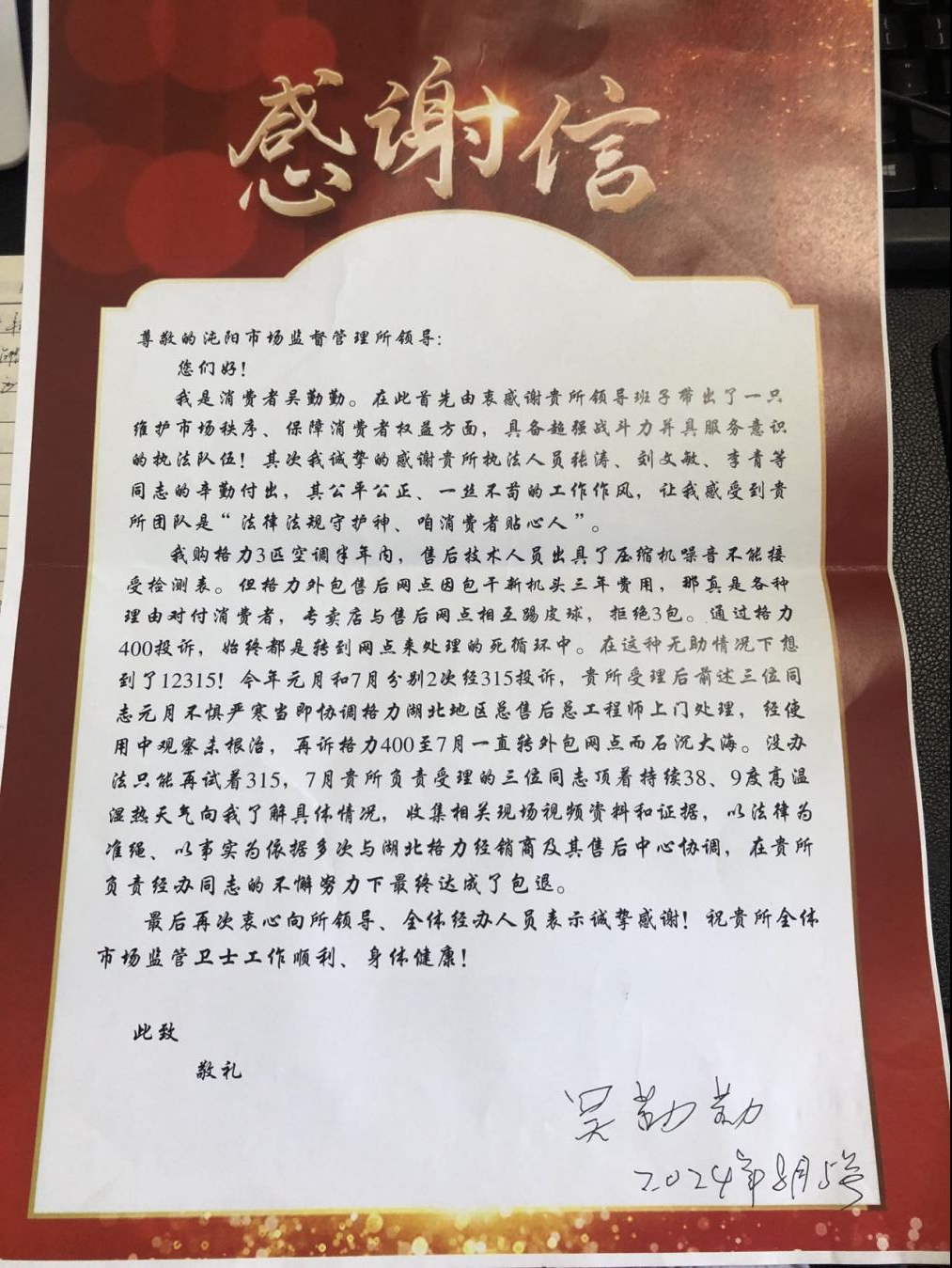 车谷融媒8月13日讯 “法律法规守护神,咱消费者贴心人。”日前,武汉经开区沌阳市场监督管理所收到了一封感谢信,信中言辞恳切,饱含感激之情。