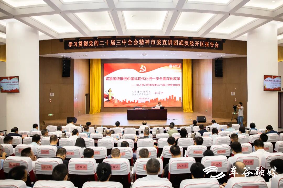 车谷融媒8月23日讯 8月23日,学习贯彻党的二十届三中全会精神市委宣讲团武汉经开区报告会暨工委理论学习中心组(扩大)报告会举行。省委、市委宣讲团成员,江汉大学党委书记覃道明作宣讲报告。市委常委、武汉经开区工委书记刘子清主持并讲话。