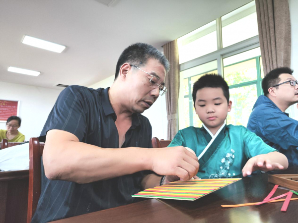 随后的竹编传统手艺制作环节,在志愿者老师的指导下,大家将散乱的竹条逐排编织,待调整定型后,形成一块方正的竹编板,又将各种图案的板卡用双面胶固定在编制好的竹编板上,一幅幅精美的“隔辈亲 智慧爱”竹编画就呈现眼前。