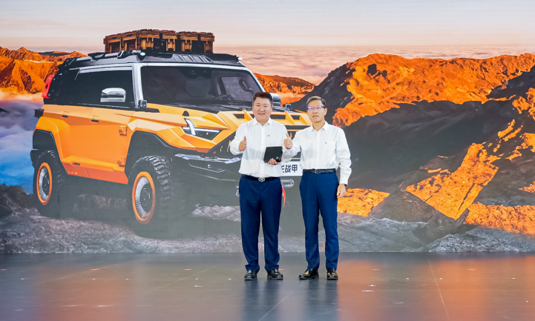 活动现场,东风汽车总经理、党委副书记周治平向东风猛士917蛟龙战甲001号车主——博纳影业创始人、董事长于冬交付新车。