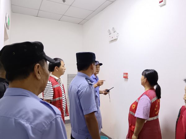 此外,为检验高层建筑火灾自动报警系统是否能正常工作,辖区辅警、社区工作人员及志愿者和物业公司一行10余人,一同进行了现场检验,物业保安蔡师傅向保安团队讲解手动火灾报警按钮的作用,并亲自示范。“只要把报警按钮按下去,消防控制室就会收到报警信号。”蔡师傅刚一按下去,对讲机里就传来了警报指令,迅速验证了系统的有效性。随后还对烟雾报警器、楼栋内的消防器材和设施进行检查。
