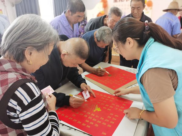描福寿字环节,老人们用毛笔认真书写着“福”与“寿”字,待作品完成,老人拿着福寿图笑容满面地说着“福寿安康”的美好祝愿。