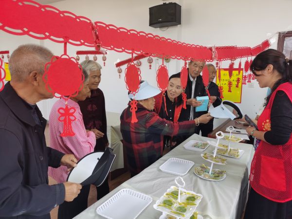 在茶点区域,老人们聚在一起,品尝着香甜的茱萸糕、喝着菊花茶、交流着生活中的点滴趣事,场面温馨而和谐。