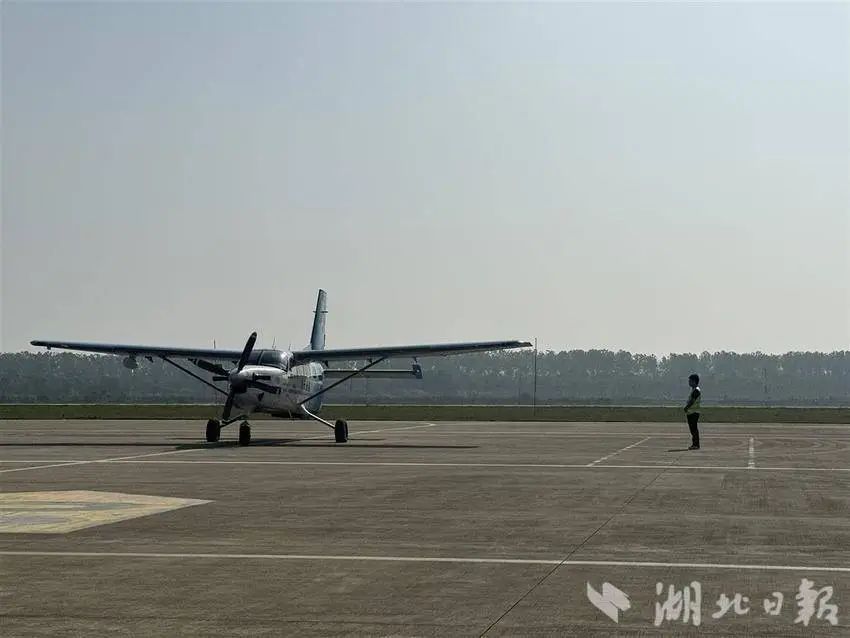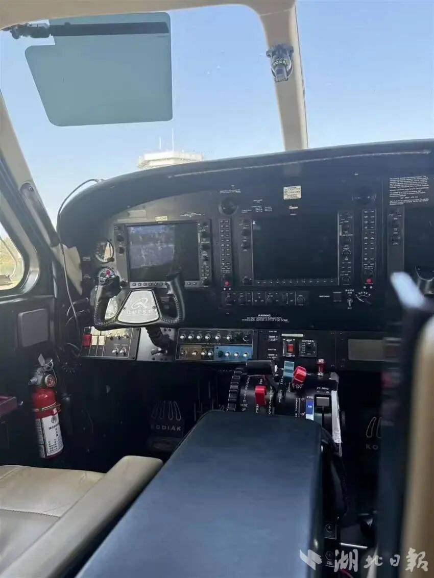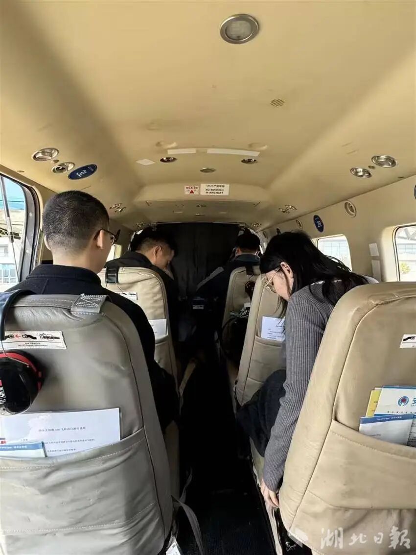 上午9时30分,记者看到,一架Kodiak100型(大棕熊)飞机已稳稳停靠在停机坪上,来自湖北楚天通用航空有限责任公司的执飞机长万才纹、倪华健,正在进行飞行前的准备工作。据介绍,该航线实行双机长制,执飞机长的飞行经验均在10年以上,同时配备安全员,以确保低空短途飞行安全。