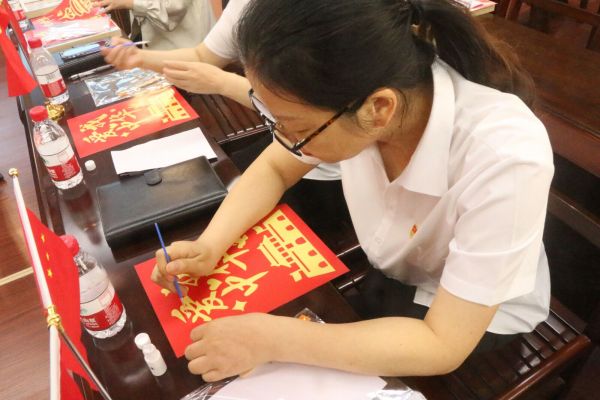 红色非遗手工制作中,党员们一粘一扫、铺满填色,通过上胶、贴箔等步骤,一幅幅熠熠生辉的“万里长城、天安门”金箔画逐渐成形,有“中国梦”的美好祝福,还有“盛世中华”的美好期盼。