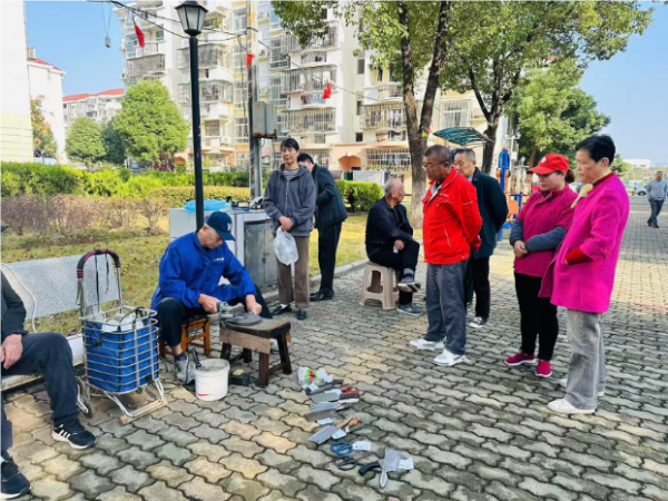 服务项目中,磨刀、理发等“明星摊位”尤其受到欢迎。专业理发师为老人们提供了精致的理发服务,让他们在清爽的发型中度过美好的一天;同时,磨刀师傅忙碌地打磨着居民带来的各种刀具,确保每一件工具都能恢复锋利;缝纫区更是吸引了不少居民带着需要修补的衣物前来,缝纫师细心地进行缝补和装饰;而在修伞区,技艺娴熟的修理师则忙着修复破损的雨伞。