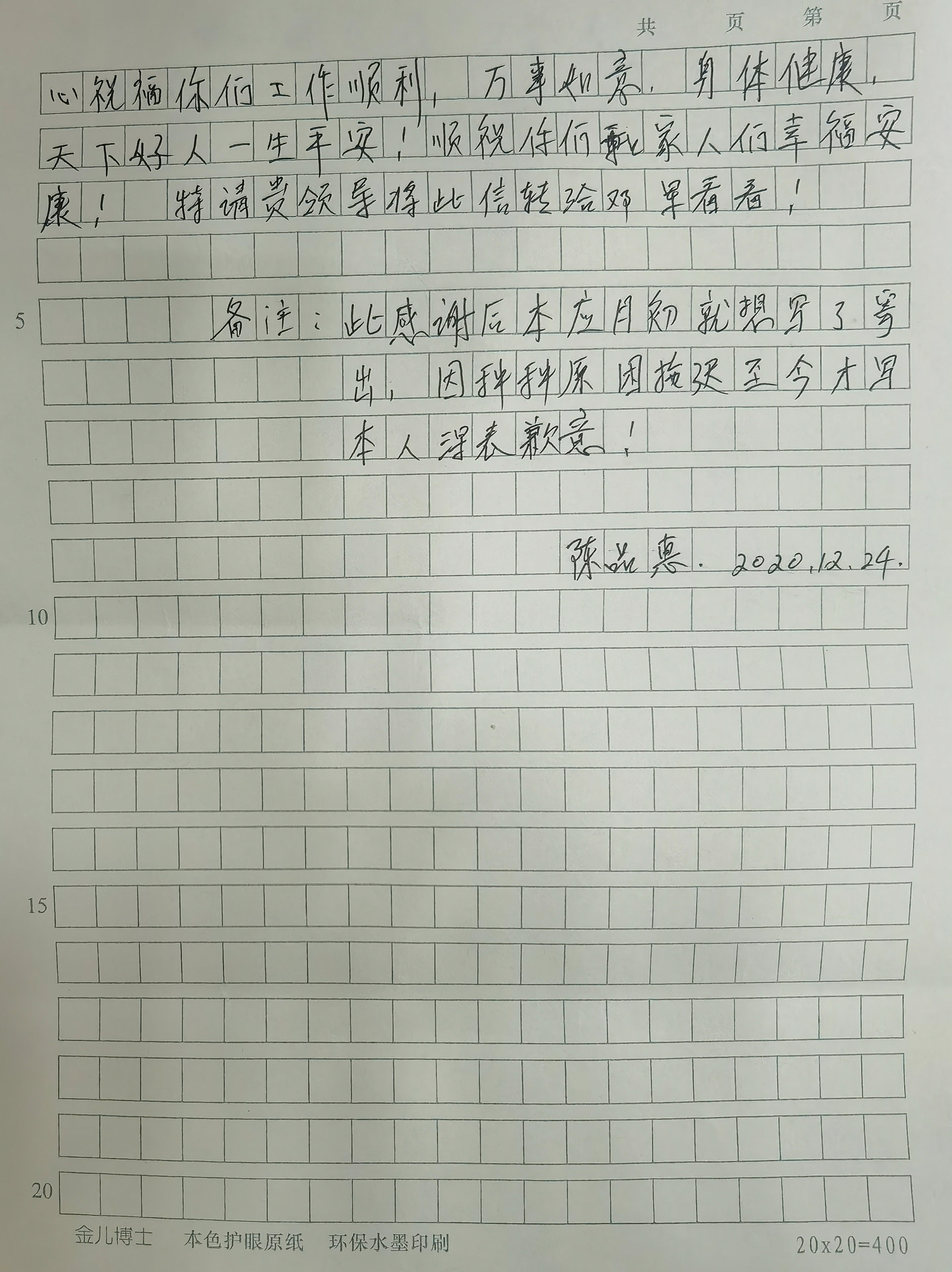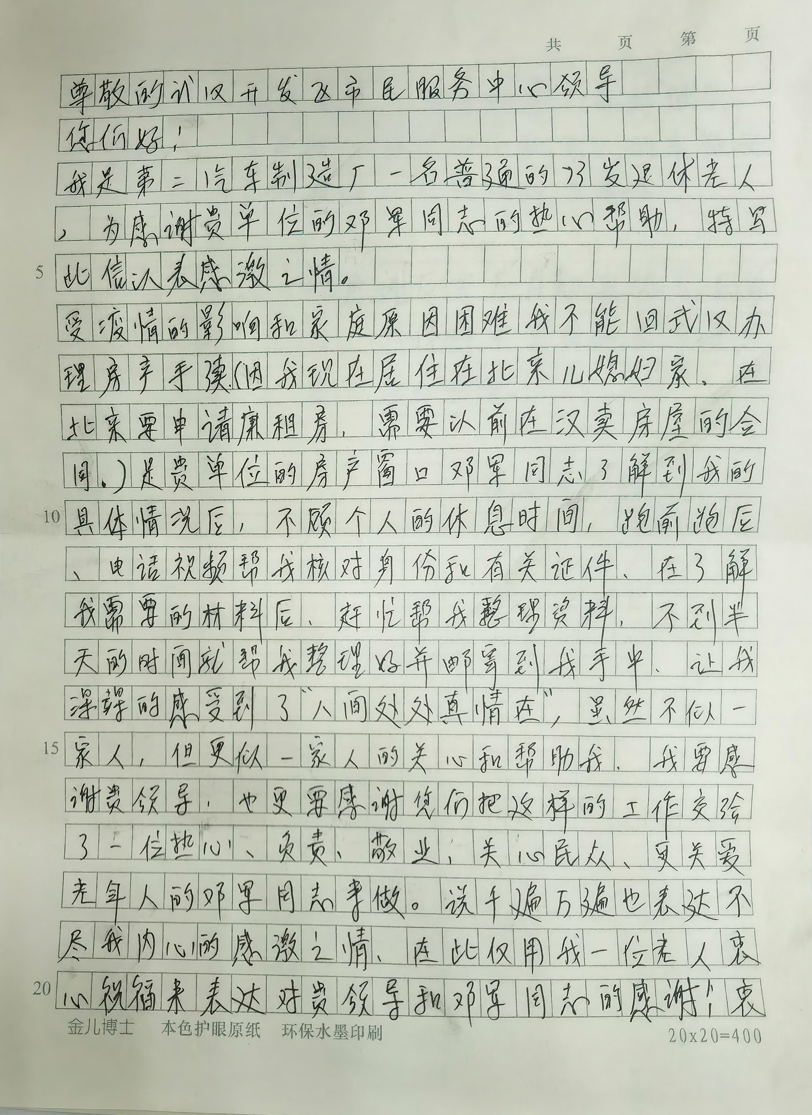 车谷融媒1月5日讯 “感谢武汉经开区房产窗口的邓军同志,利用自己的休息时间,不到半天的时间就帮我把所需资料整理好并邮寄到了我手中,让我深深感受到了‘人间处处真情在’,虽然不是一家人,但更似一家人的关心和帮助!”元旦期间,邓军意外收到了从北京寄来的一封感谢信,字里行间都是对房产窗口工作人员邓军贴心为民服务的感谢。