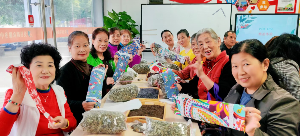 在老师的指导下,居民们纷纷动手,将中药材小心翼翼地装入布袋中。一边制作安神药枕,一边交流制作心得,现场气氛温馨而融洽。不一会儿,一个个精美又饱满精致的艾草枕制作完成,居民们看着自己亲手制作的药枕,脸上洋溢着快乐的笑容。
