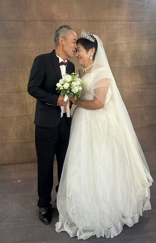 74岁的张玲香穿上洁白的婚纱,显得格外精神,她与74岁的丈夫孙必浩相伴已有50多年。张奶奶幸福地望着西装革履、精神抖擞的老伴说:“这是我们第一次化妆、拍结婚照。十分感谢社区平时对我们老人的照顾。”