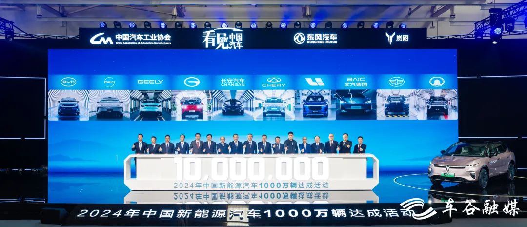 车谷融媒11月14日讯 中国新能源汽车迎来发展史上的又一重大里程碑时刻。11月14日,2024年中国新能源汽车1000万辆达成活动在武汉经开区举行。现场,一辆新能源纯电岚图知音缓缓驶下武汉东风云峰工厂生产线,携手多款国产新能源汽车,一起揭开了2024年中国新能源汽车1000万辆达成的新篇章。至此,中国成为全球首个新能源汽车年度达产1000万辆的国家。