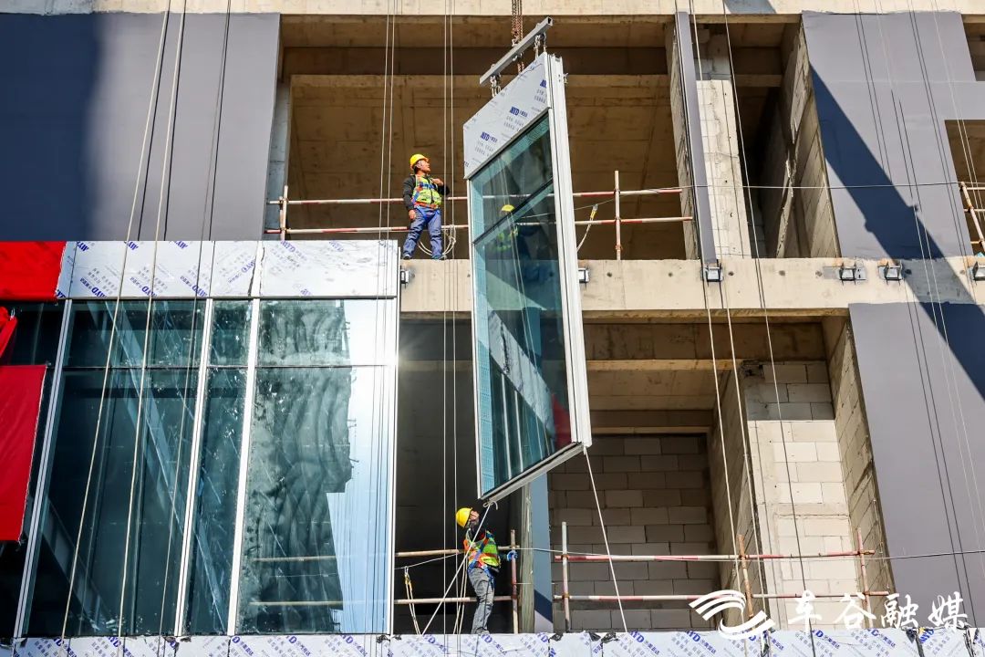 在项目建设现场,记者看到,目前正在进行楼体全玻璃幕墙安装,工人们忙着进行大规模幕墙吊装施工所必须的前置预埋件、连接件安装;大楼C区、D区裙楼转接件已基本焊接完成,首批巨幅玻璃幕墙正有序上墙。