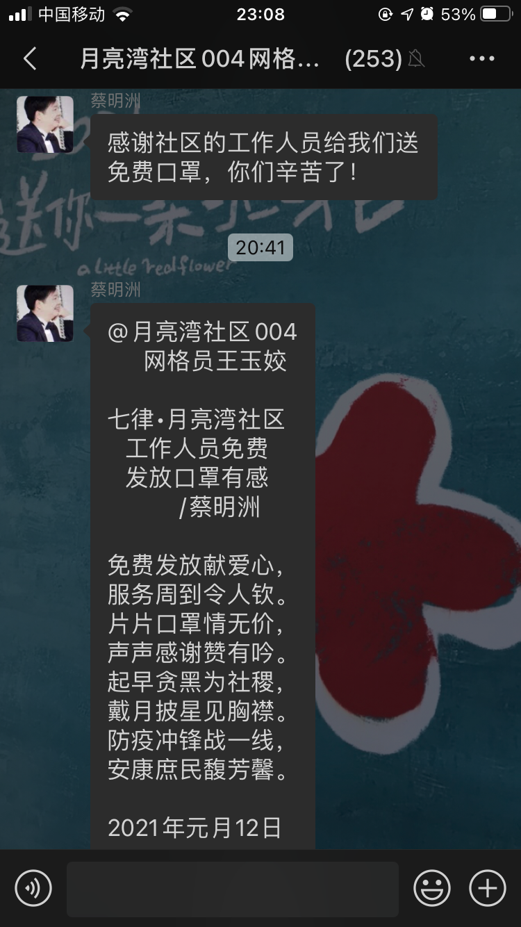 居民蔡师傅更是在居民群中赋诗一首,表达对政府的感谢之心和对社区工作人员的关切之心。“免费发放献爱心,服务周到令人钦。片片口罩情无价,声声感谢赞有吟。起早贪黑为社稷,戴月披星见胸襟。防疫冲锋战一线,安康庶民馥芳馨。”