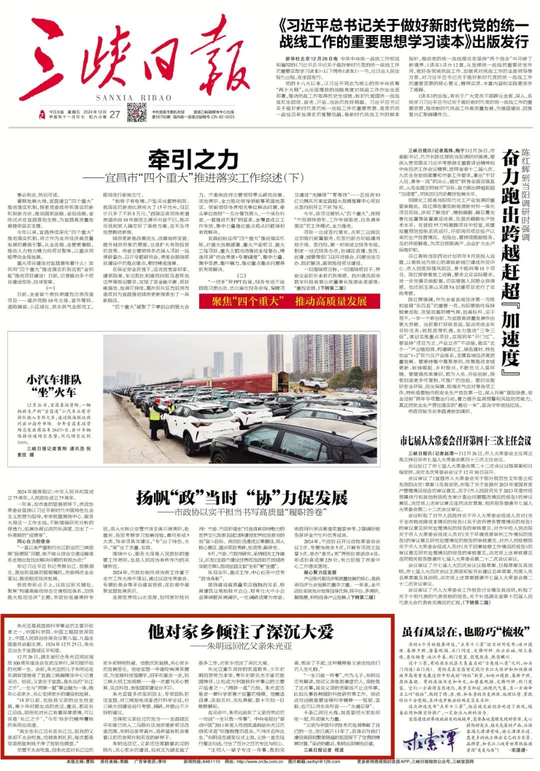 12月26日,湖北省纪念朱光亚同志诞辰100周年座谈会在武汉举行,深切缅怀他的光辉一生。会前,朱光亚的儿子朱明远在东湖宾馆接受了宜昌三峡融媒体中心记者采访。他说,父亲生于宜昌,是永远的“长江之子”,一生与“两弹一星”事业融为一体,晚年心系家乡、关心支持家乡的建设和发展。