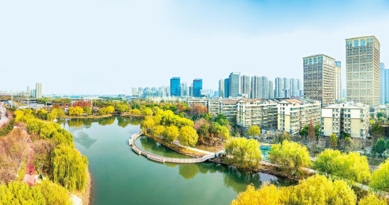 冬日暖阳下,碧绿的渠水倒映着蓝天白云,河道沿岸垂柳依依、绿树成荫。湿地、碧水、候鸟、散步的人群,和谐共生。