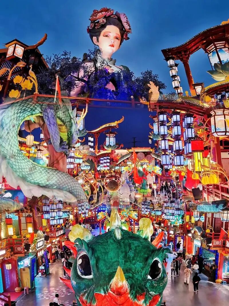 据了解,本次花灯庙会以农历蛇年为蓝本,以传统文化为底蕴,由15位自贡花灯非遗匠人精心打磨设计,历时90天筹备,搭建了30万平方米的超震撼灯会布展。现场300余款造型各异的精美灯组,将展现出独特的国潮韵味,让人眼花缭乱。
