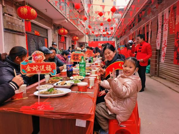 车谷融媒1月26日讯 1月23日,湘口街道康泰路社区以“‘湘’味传家风 ‘康’享幸福年”为主题的第一届邻里长街宴热闹开席,辖区共建单位、下沉党员、志愿者和居民代表们200余人围坐在一起品佳肴、话家常,共迎新春到来,共品幸福味道。
