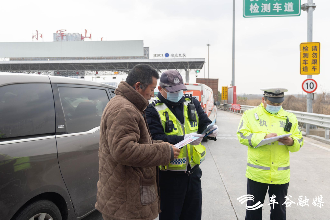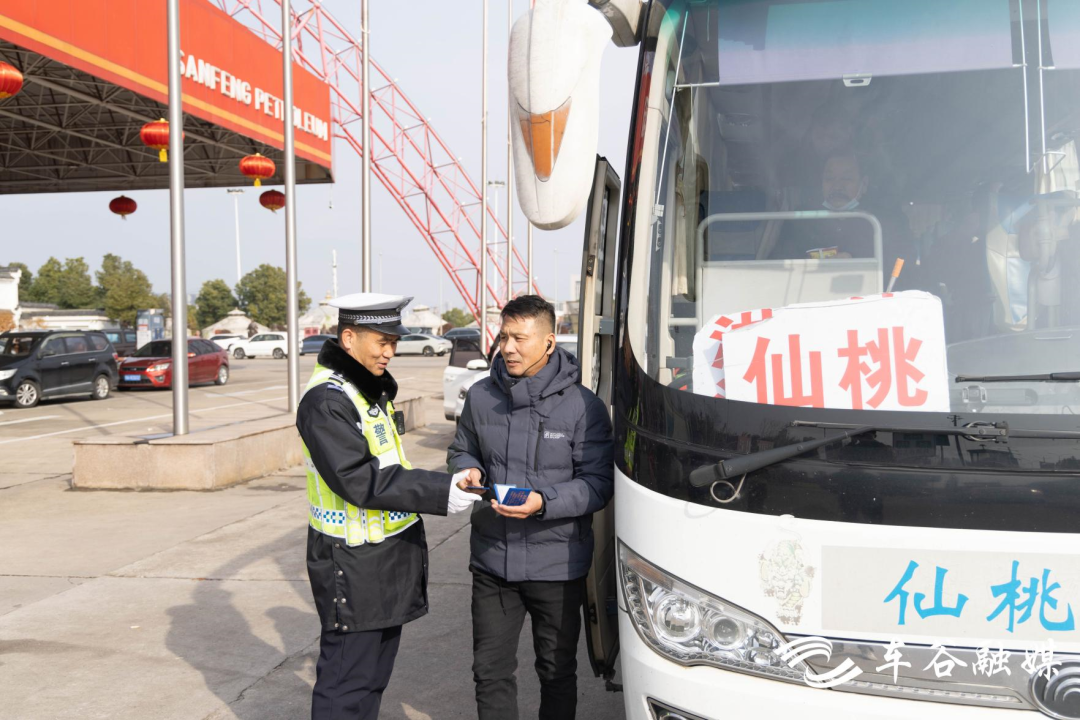 “请出示您的驾驶证,配合检查!”“请系好安全带,稳驾慢行。”汉洪高速小军山收费站是进出武汉的西南大门,春运开始后,每天有超过4万辆车通过小军山收费站。除夕当天,来自区交通大队军山中队、机动中队的交警早早来到现场,检查来往长途大巴、货运卡车的车辆超员、超载情况,并叮嘱司机开车时要谨慎驾驶。