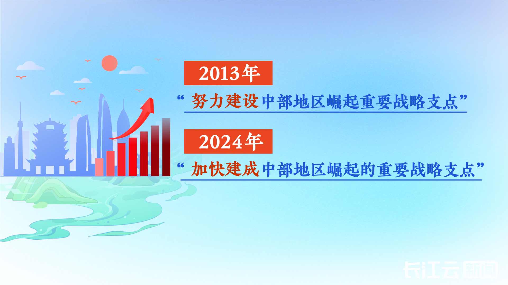 习近平总书记2013年7月视察湖北时,要求湖北“努力建设中部地区崛起重要战略支点”;2024年11月视察湖北时,又赋予湖北“加快建成中部地区崛起的重要战略支点”使命任务。从“努力建设”到“加快建成”,不仅仅是表述变化,更重要的是从“殷切期待”变成“现实任务”。