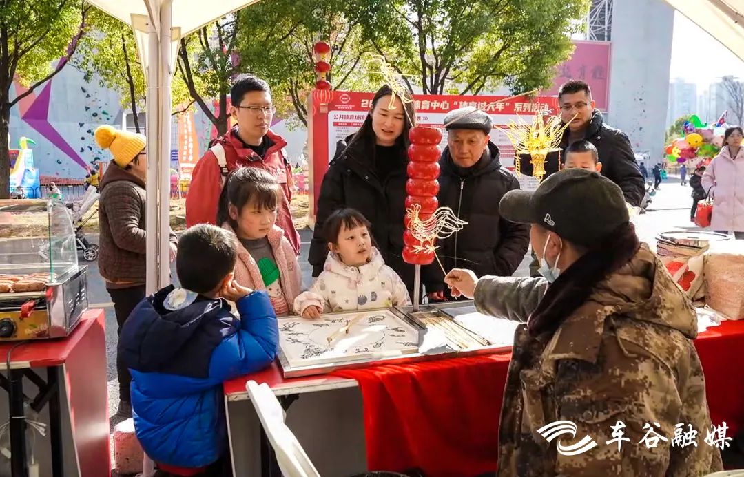 在糖画摊位前,小朋友们转起幸运大转盘,期待着心仪的糖画。拿着糖画,边走边吃,满口香甜。