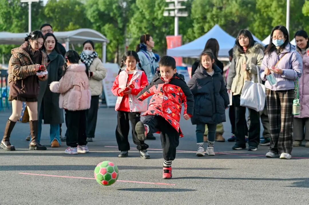 悦动场上,迷你乒乓球、迷你高尔夫、掷飞盘、眼疾手快等互动游乐项目也备受大家喜爱,足球飞镖最为热闹,互动体验的人排起了长队。7岁的骆昱驰一手拿着集卡册一手牵着妈妈,“我今天体验了猜车、猜灯谜、射箭,这里真好玩。”