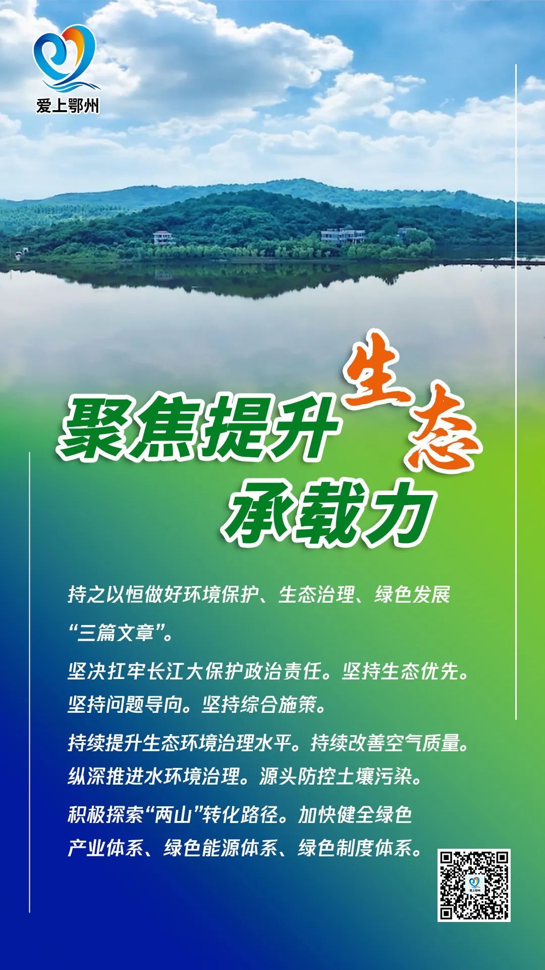 聚焦提升生态承载力,加快推动绿色低碳转型。坚决扛牢长江大保护政治责任,持续提升生态环境治理水平,积极探索“两山”转化路径,持之以恒做好环境保护、生态治理、绿色发展“三篇文章”,加快建设美丽城市、美丽乡村、美丽山川。