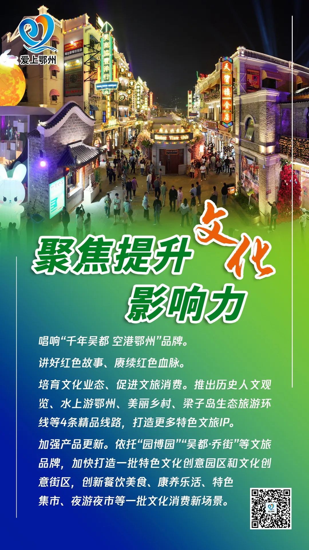 聚焦提升文化影响力,加快建设文化强市。延续历史文脉、传承文化基因,讲好红色故事、赓续红色血脉,培育文化业态、促进文旅消费,加强对鄂州历史文化的研究和阐释、文化遗产的挖掘和整理,推动优秀传统文化创造性转化、创新性发展,全面推进文化事业和文旅产业高质量发展。