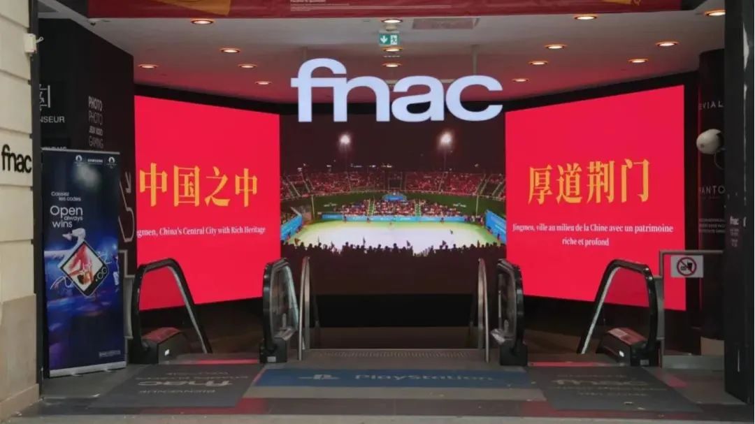 法国巴黎香榭丽舍大街Fnac入口处“中国之中 厚道荆门”宣传语 图片来源:新华社