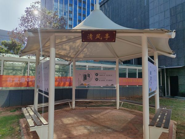 在永济社区,一座白色的“六角亭”屋檐上,“清风亭”牌匾格外醒目。亭内设置的廉政小故事,选取古今廉洁典范,用通俗易懂的故事,向居民传递廉洁理念,以文化人,以廉育人,在社区营造浓厚的廉洁文化氛围。