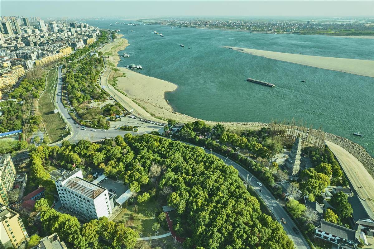 鸟瞰荆州长江沿岸,绿意盎然。荆楚大地水更清、岸更绿、景更美。(视界网 张梦瑶 摄)