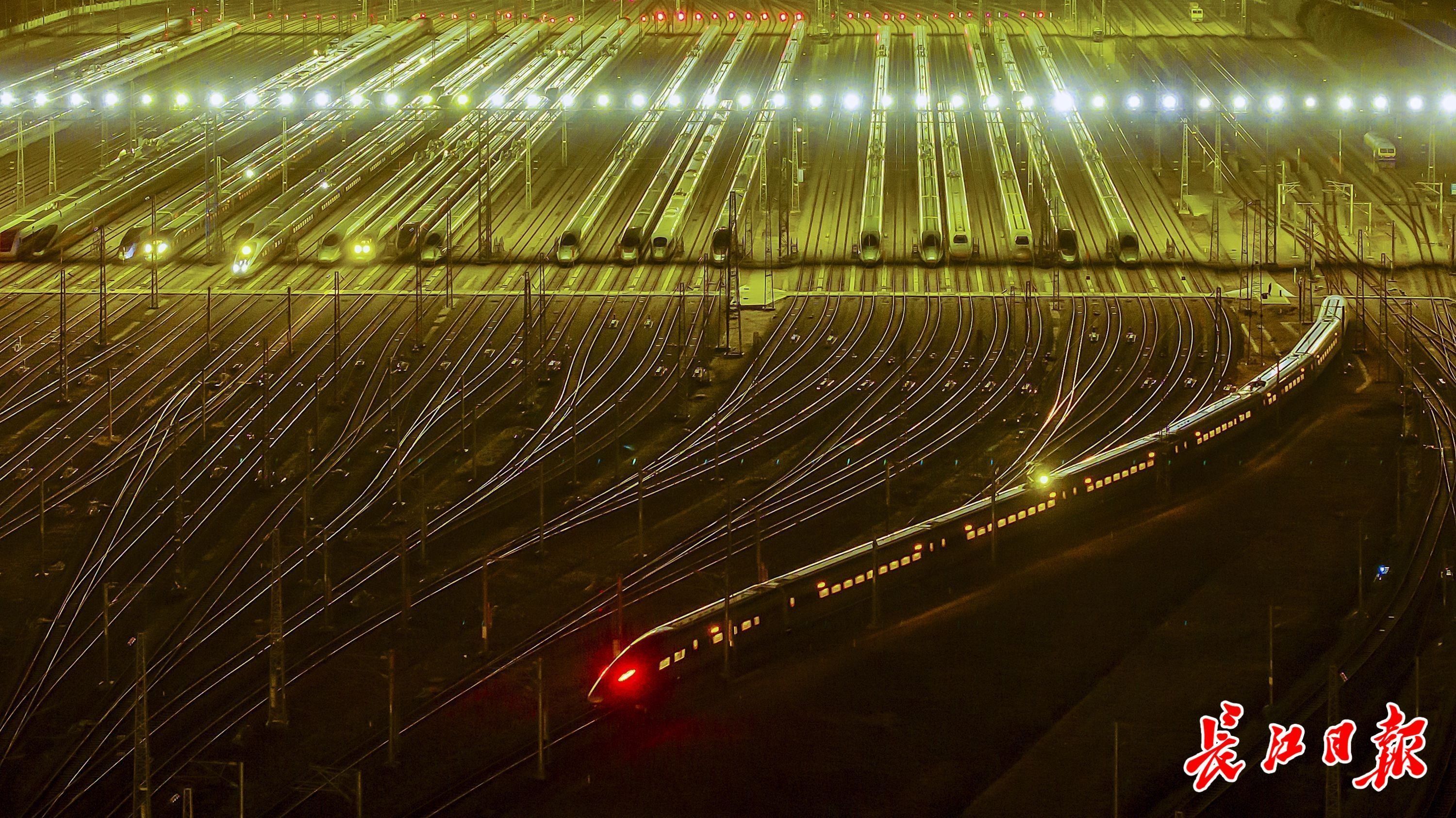 1月28日,早上5点多,动车依次从动车段驶出武汉动车段。 记者胡冬冬 摄