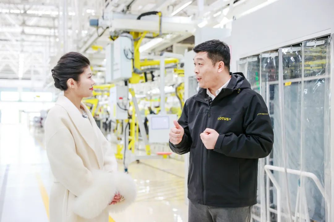 ▲莲花汽车全球智能工厂副总经理赵松(右)带各国网友“云”游总装车间。