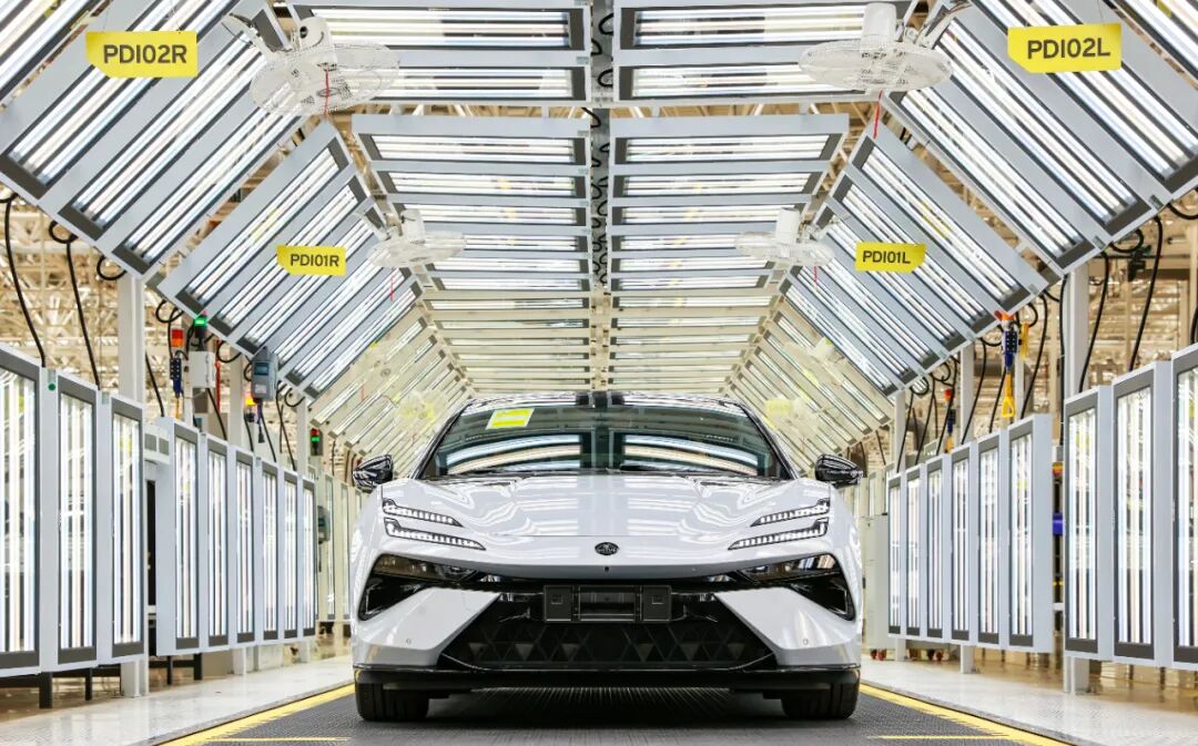 在总装车间,往来穿梭的零件小车根据客户下单内容,搭载不同的车辆零部件,运送至生产线;针对车辆关键拧紧点,采用行业第一的拧紧工具,实现3%的控制精度,同时数据也可实时监控并能永久追溯;通过涂胶机器人实现全自动风挡玻璃安装,抓取、涂胶、安装等全流程均由视觉监控,保证装配质量统一。