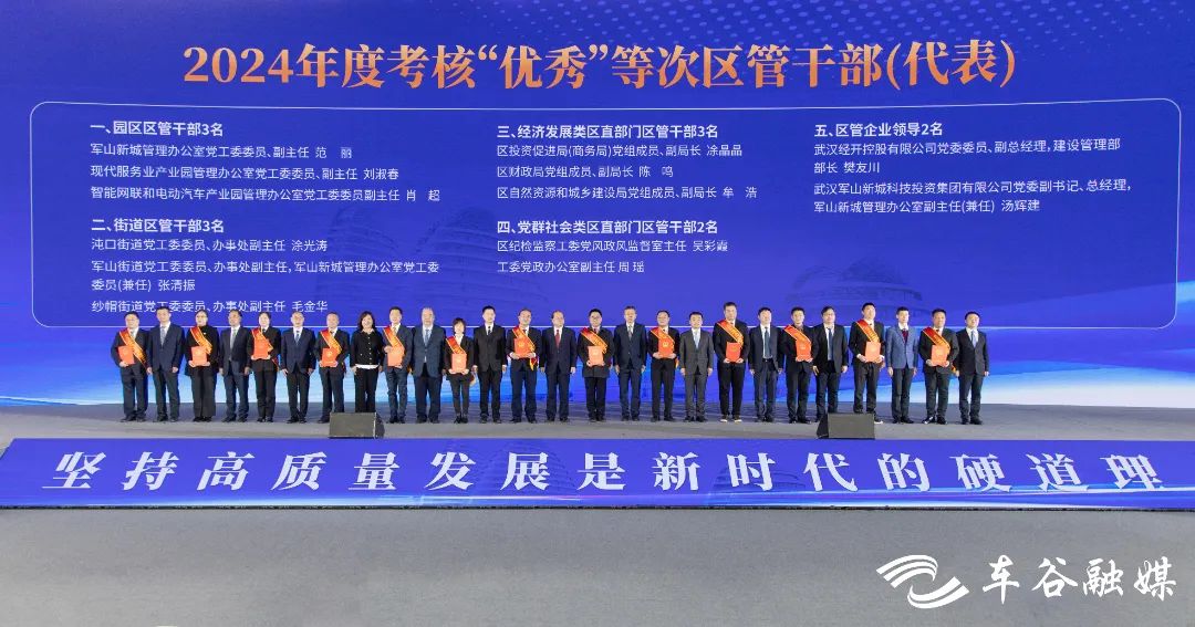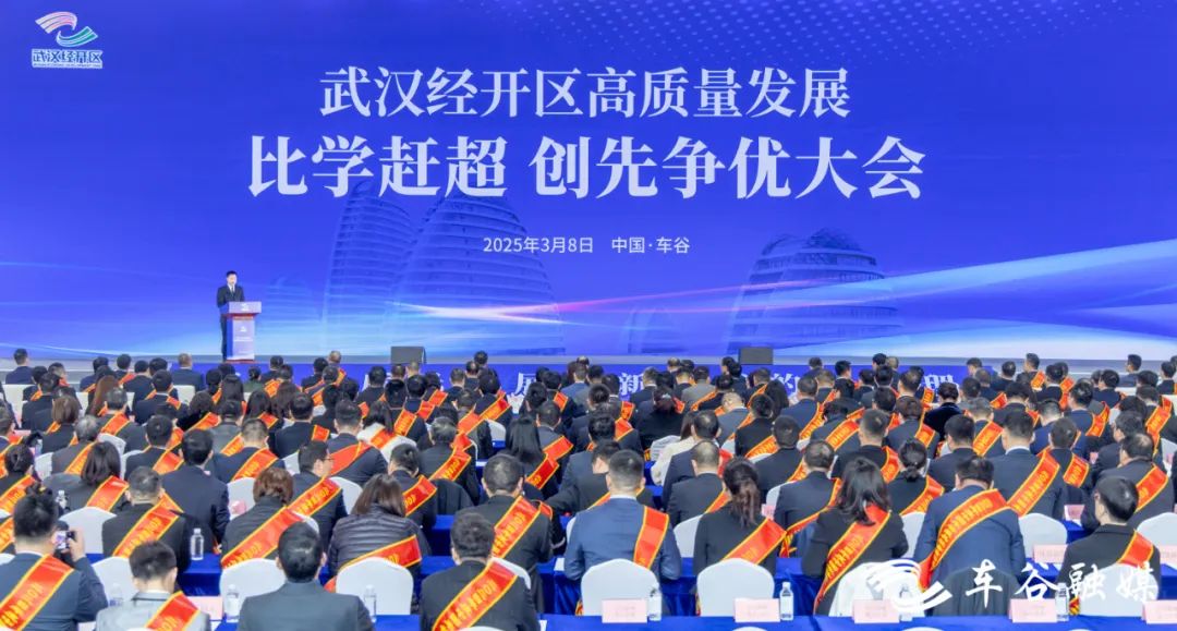 车谷融媒3月8日讯 春和景明,万象更新。3月8日,武汉经开区高质量发展比学赶超创先争优大会举行,总结经验、表彰先进,比学赶超、创先争优,动员全区上下聚焦支点建设,强化责任和担当,以更加奋发有为的精神状态,扎实推动全区经济社会高质量发展,奋力实现车谷“二次创业”新跨越,为湖北加快建成中部地区崛起重要战略支点贡献经开力量。