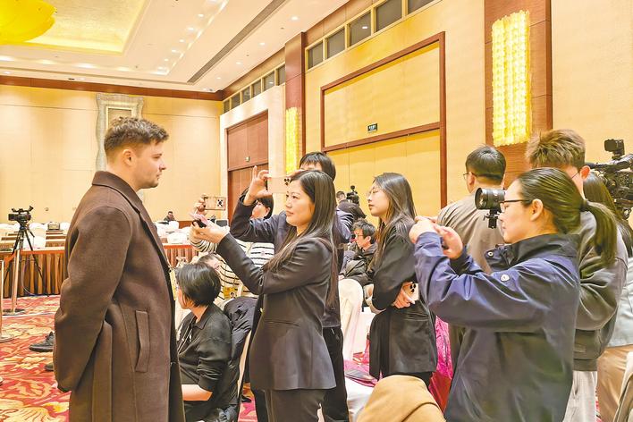 3月6日,湖北代表团开放日现场,湖北日报全媒记者采访俄罗斯新闻社记者阿列克谢。 (湖北日报全媒记者 任勇 摄)