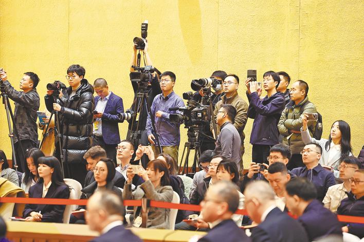 ▲ 3月6日上午,十四届全国人大三次会议湖北代表团举行第三次全体会议暨媒体开放日活动,审议政府工作报告,并向中外媒体全程开放。 (湖北日报全媒记者 李溪 摄)