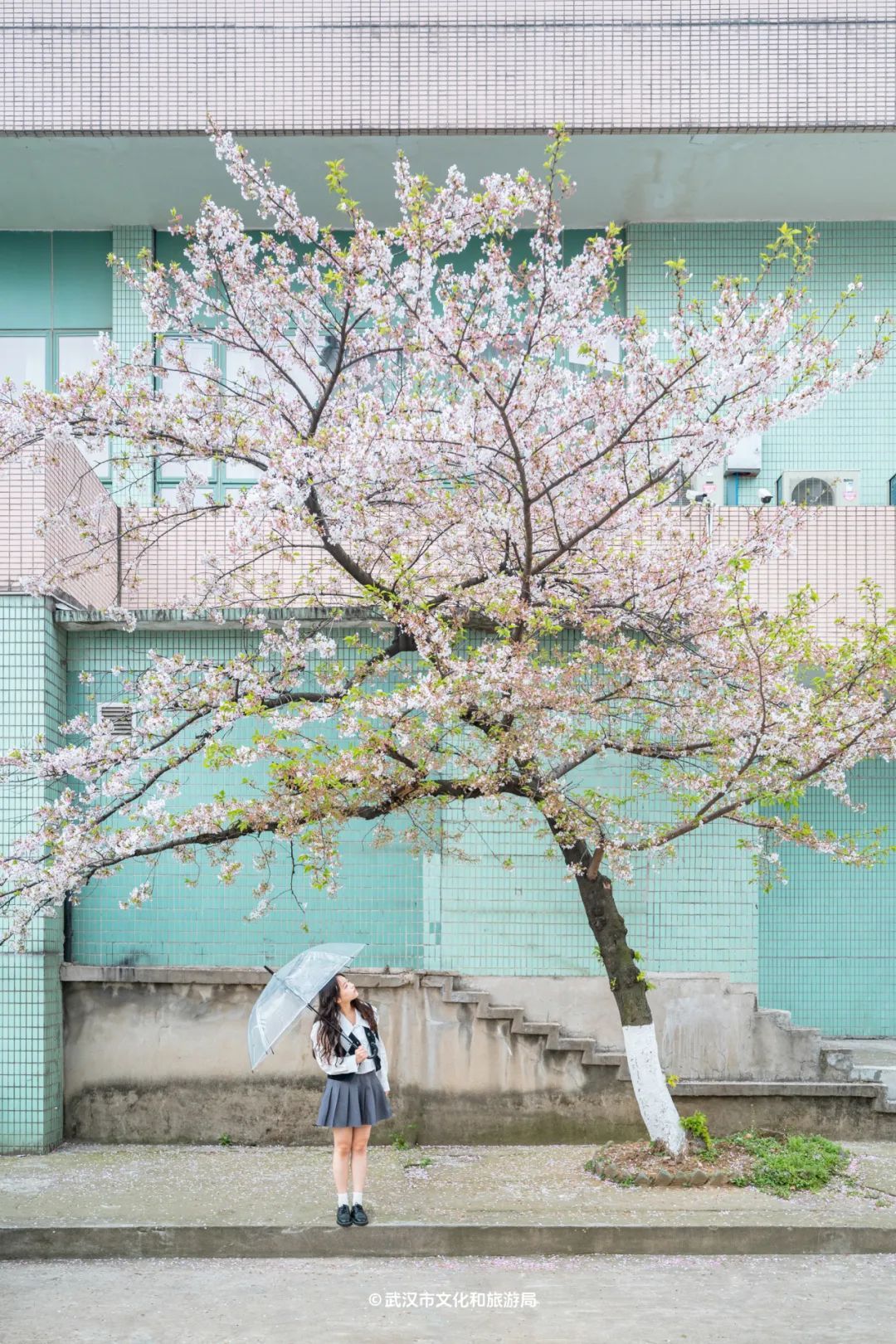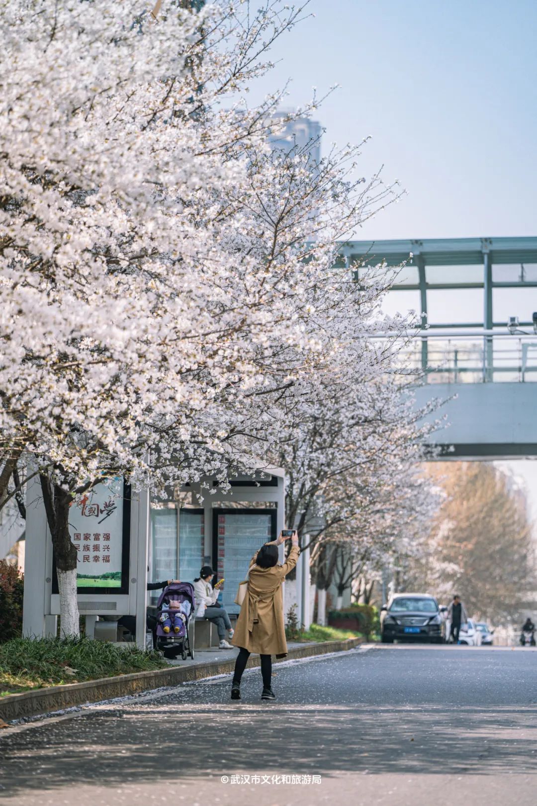 这个站点的樱花树数量不多,但长势良好,且每年春天花开繁盛,美如画卷,被网友亲切称为“开往春天的公交站”。从光谷四小天桥往下拍,氛围感拉满。